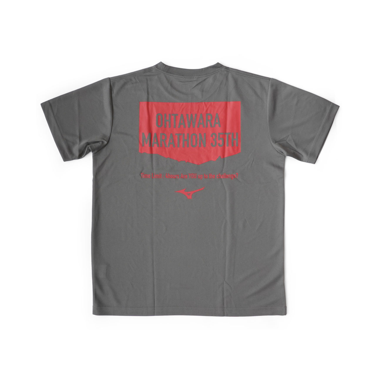 A) もともと、高低差を入れたかったんですが、なかなかいいものが出来ずにいました。試行錯誤している中で四角い枠にしてみた時に、高低差が伝わりやすい形になったんです。また、OHTAWARA MARATHO 35thの文字を入れることでインパクトも出すことができたので、このデザインにしました。色は、制限時間やこの大会の厳しさ、ランナーの皆さんの熱い想いを表現するために赤色をベースに一色に仕上げました。前面は背面と形が違って、日の出をモチーフに力強さや希望を表現しました。