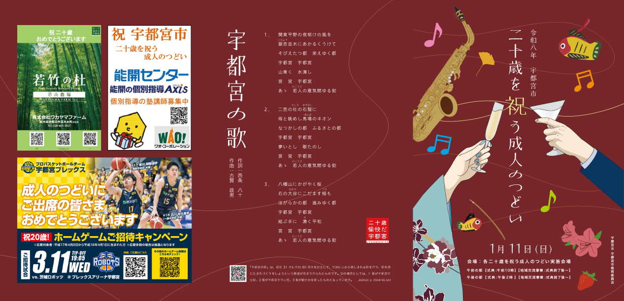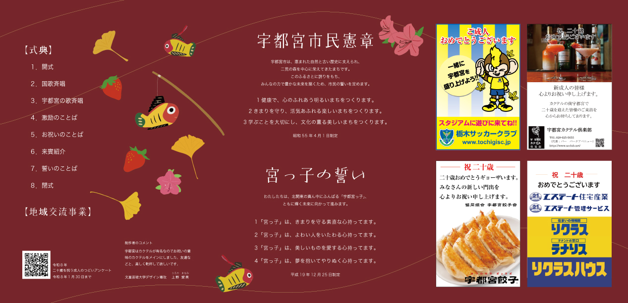 令和8年宇都宮市二十歳を祝う成人のつどいのプログラムを、本学のデザイン専攻2年生、上野愛美さんが制作しました。