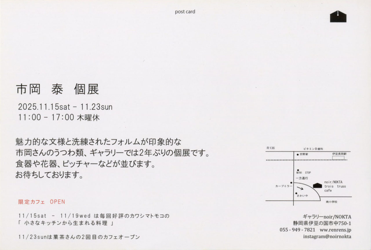 本学デザイン専攻工芸分野非常勤講師の市岡泰先生の作品展がギャラリーnoir/NOKTAにて開催中です。